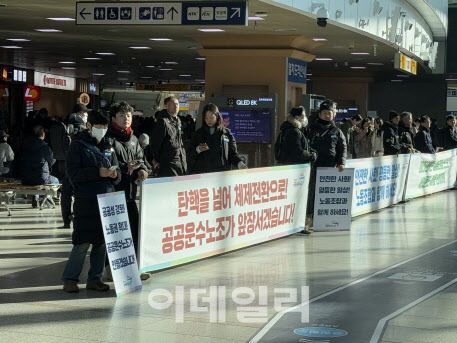 서울역사 내 ‘탄핵을 넘어 체제전환으로!’ 포스터를 들고 시위를 진행하던 공공운수노조 관계자들은 “당신들 때문에 시민이 편안하지 않다, 폭동 옹호세력 국짐당은 해체하라”며 고함을 쳤다. 이에 김상훈 정책위의장은 이동하며 “시끄럽다”고 대응했다.