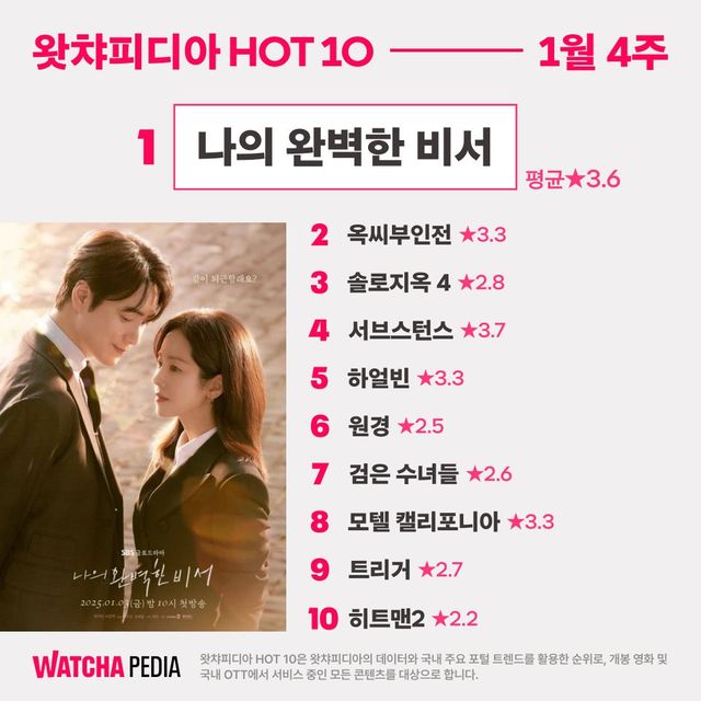 왓챠는 1월 16일부터 22일까지 집계된 1월 4주차 '왓챠피디아 HOT 10'을 공개했다. '왓챠피디아 HOT 10'은 별점, 검색량, 보고 싶어요, 코멘트 수 등 다양한 데이터와 주요 포털 트렌드 지표를 종합해 한 주간의 대중 관심도와 화제성을 반영한 순위다.