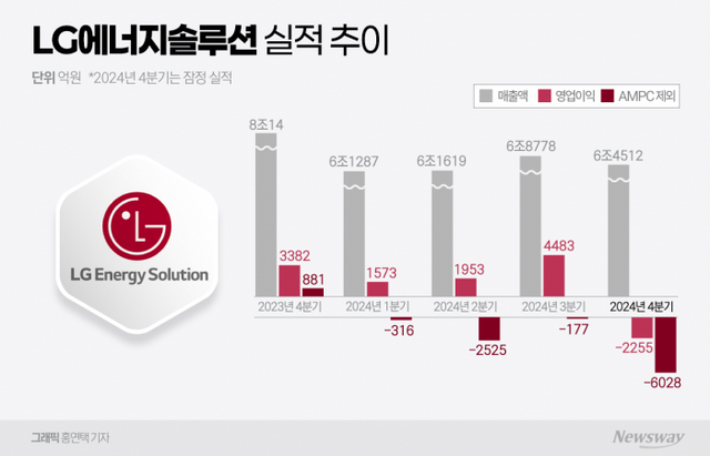 4분기 기준으로는 매출 6조4512억원, 영업손실은 2255억원을 기록했다. 매출은 전년 대비 6.2% 줄었고, 영업손익은 적자 전환이다. 다만 미국인플레이션감축법(IRA)에 따른 첨단제조생산세액공제(AMPC)를 제외하면 4분기 영업적자는 6028억원으로 집계됐다. 작년 4분기 세액 공제 금액은 3773억원이다.