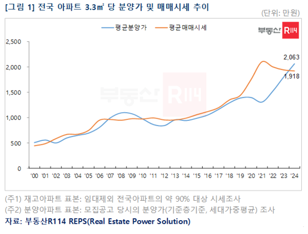 2024년 기준 전국과 서울에서의 3.3㎡당 평균 아파트 분양가는 각각 2,063만 원과 4,820만 원으로 조사됐다. 반면 아파트 매매시세는 전국 1,918만 원, 서울은 4,300만 원으로 조사됐다. 시세 대비 전국은 145만 원, 서울은 520만 원 각각 비쌌던 것이다.