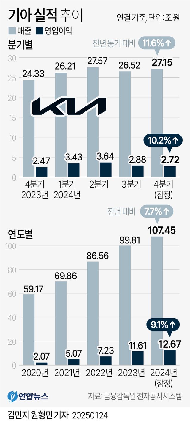 기아는 24일 열린 기업설명회에서 지난해 연결 기준 매출 107조4488억원, 영업이익 12조6671억원을 기록했다고 밝혔다. 이는 2010년 새 회계기준(IFRS) 도입 이후 종전 최대 실적이었던 2023년 매출(99조8084억원)과 영업이익(11조6079억원)보다 각각 7.7%, 9.1% 증가한 것이다.