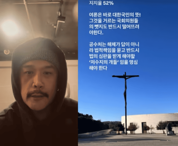 또한 "지지율 52%"라고도 적고 "여론은 바로 대한민국의 뜻! 그것을 거르는 국회의원들의 뱃지도 반드시 떨어뜨려야 한다. 공수처는 해체가 답이 아니라 법적 책임을 묻고 반드시 법의 심판을 받게 해야할 '저수지의 개들'임을 명심해야 한다"라고 주장했다.