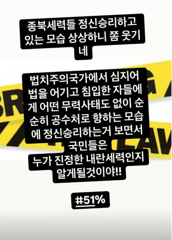 이어 'breaking the law'라는 문구가 담긴 이미지 컷에는 "종북세력들 정신승리하고 있는 모습 상상하니 쫌 웃기네"라며 "법치주의 국가에서 심지어 법을 어기고 침입한 자들에게 무력 사태도 없이 순순히 공수처로 향하는 모습에 정신승리하는 거 보면서 국민들은 누가 진정한 내란 세력인지 알게 될거야"라고도 전했다.