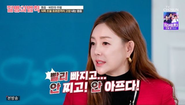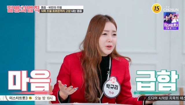 트로트 가수 박규리가 TV조선 ‘질병의 법칙’을 통해 “살이 찌면서 허리 통증에 시달린다”고 호소했다. 극단적 식단까지 도전했던 그는 전문가의 조언에 따라 체중 관리가 아닌 ‘염증 관리’로 해답을 찾아 나섰다.