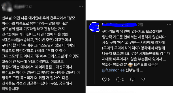 또 다른 글에서도 대사에 대한 비판이 이어졌다. SNS에 올라온 글에 의하면 "(천주교 구마의식 중) 성모마리아의 이름으로 명한다 라는 말을 하나요? 개신교에서 천주교는 마리아를 믿는다고 비난하는 사람들도 있는데 그런 비난의 목소리가 더 커질 것 같다"고 말했다. 실제 천주교 기도문에서 그런 말을 쓰지 않는다"고 했다.