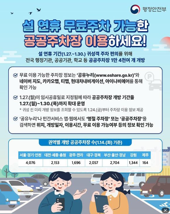 설 연휴 기간(1.27.~1.30.) 귀성객 주차 편의를 위해 전국 행정기관, 공공기관, 학교 등 공공주차장 1만 4천여 개를 개방합니다!