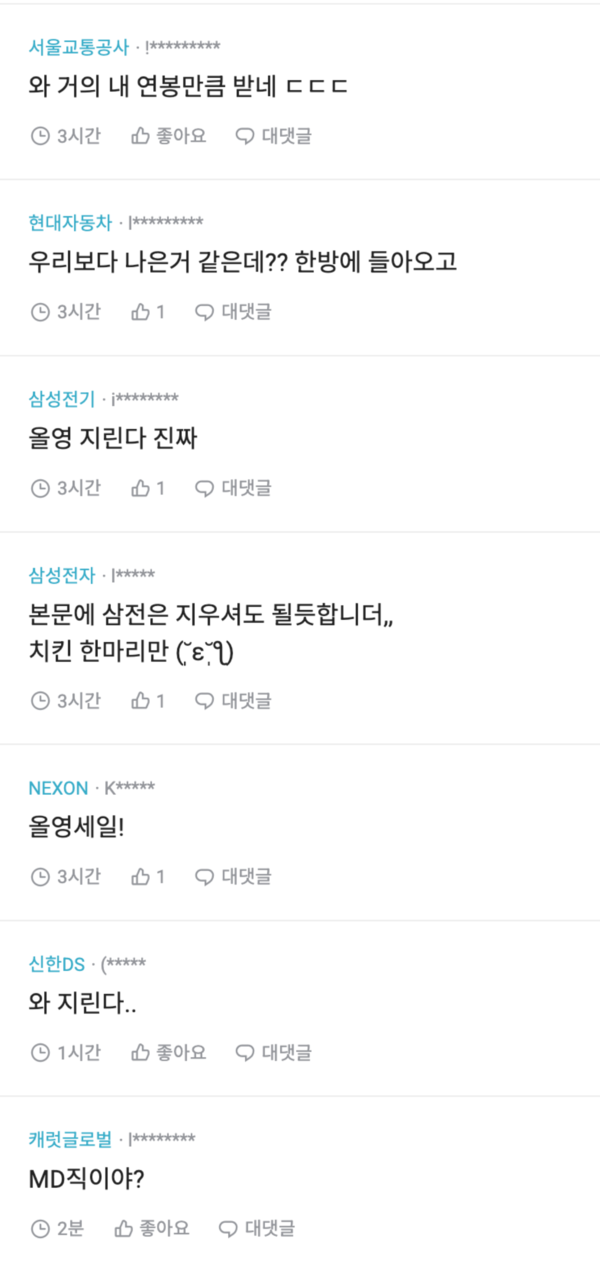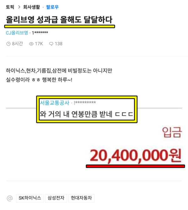 이 소식에 대해 다른 업종의 직장인들이 놀라움을 표하며 다양한 반응을 보이고 있다. 특히 서울교통공사의 한 직원은 댓글을 통해 "와 거의 내 연봉만큼 받네"라며 부러움을 나타냈다.