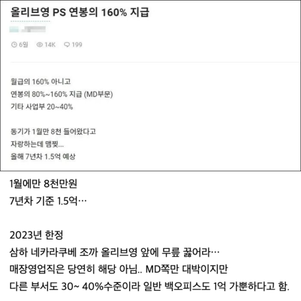 이전에 한 커뮤니티에 올라온 게시물에 따르면, 올리브영의 7년차 직원의 연봉을 1억 5천만 원으로 예상하고 있으며, 일부 MD 직군은 1월에만 8천만 원 이상의 성과급을 받았다는 내용이 공유되었다.