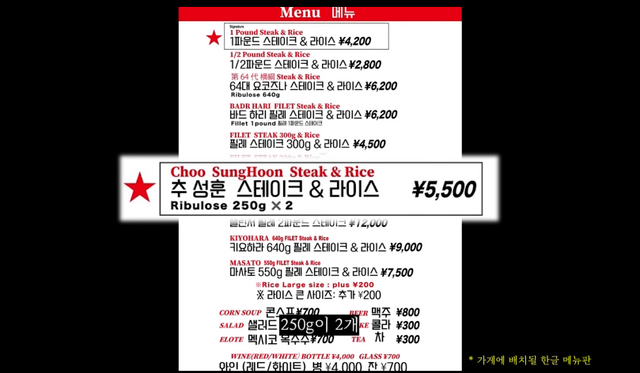 (엑스포츠뉴스 황혜윤 기자) 추성훈이 소개한 일본 스테이크 맛집이 한국인 맛집으로 유명해지면서 해당 가게에 추성훈 메뉴가 생겼다.