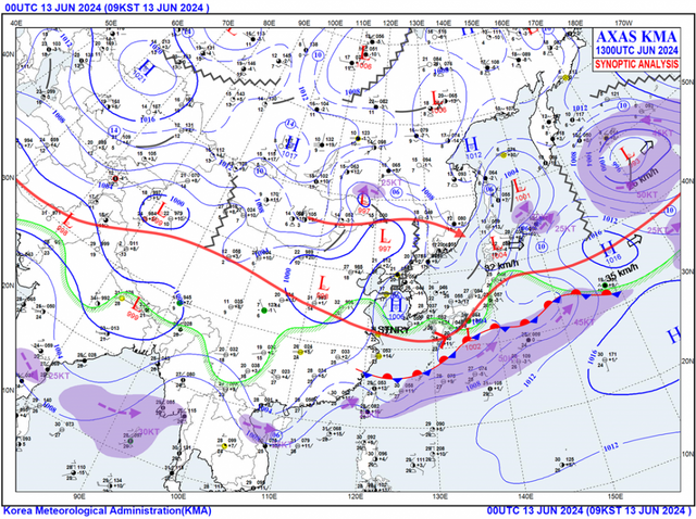 2. 현재 장마전선의 위치는 대만 북쪽에서 일본 남쪽 해상까지이며, 이 선은 북태평양 고기압의 경계선과 일치함