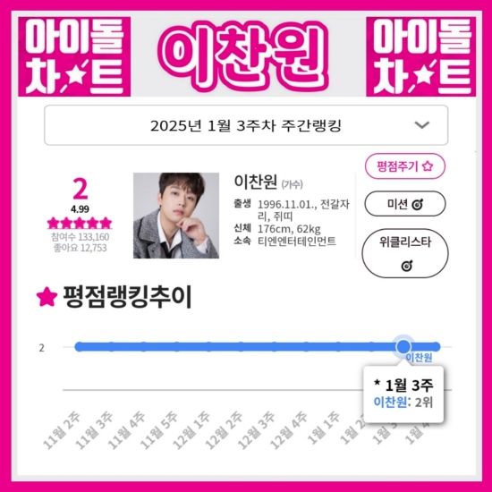 아이돌차트는 최근 이찬원이 2025년 1월 3주 차 평점 랭킹에서 133,160표를 받아 2위를 차지했다고 밝혔다.