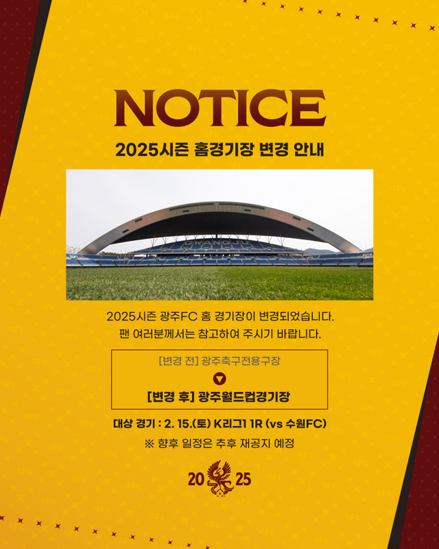 광주는 내달 15일에 펼쳐지는 2025시즌 K리그 홈 개막전(VS 수원FC) 경기를 아시아축구연맹(AFC) 챔피언스리그 엘리트(ACLE) 홈구장으로 사용하고 있는 광주월드컵경기장으로 변경한다고 밝혔다.
