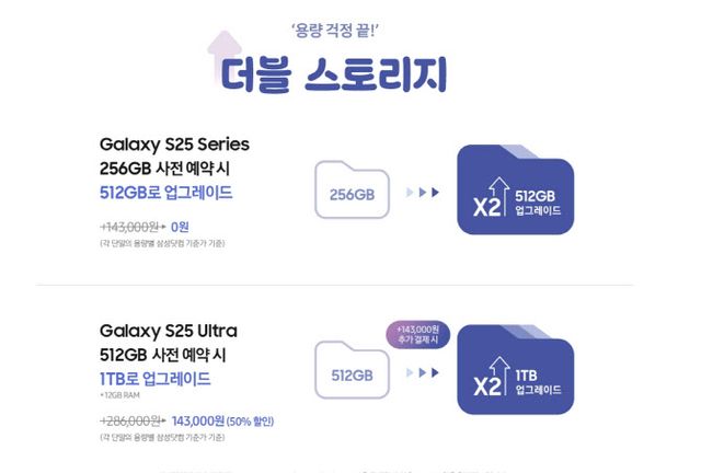 삼성전자는 프리미엄 스마트폰 출시 때마다 사전 판매기간에 스토리지 용량을 두 배로 늘려주는 ‘더블스토리지’ 혜택을 제공하고 있다. 이번엔 갤럭시 S25 전 모델 512GB 스토리지 제품을 256GB 가격에 제공한다. 512GB 제품을 정가에서 14만3000원 할인해 판매하는 셈이다. 더블스토리지 혜택을 통해 울트라 12GB 메모리 1TB 제품도 14만4300원 할인한다. 또 삼성전자는 사전판매 기간에 삼성닷컴 앱에서 사용할 수 있는 ‘갤럭시 워치7’ 15만원 할인 쿠폰도 증정한다. 이외에도 △유튜브 프리미엄 3개월 체험권 △윌라 3개월 구독권 및 추가 3개월 50% 할인권 △모아진 3개월 구독권 등 다양한 콘텐츠 구독 혜택도 지원한다.
