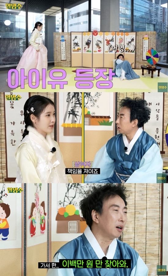 근황토크에 이어 박명수는 아이유의 한복 차림을 치켜세웠다. 아이유는 "세배 드리러 오는데 (예쁘게 하고 와야 한다)"라고 했고, 박명수는 흐뭇해하며 "가서 200만 원만 찾아와라"라고 애정을 드러냈다.