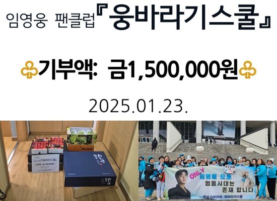 임영웅 팬클럽 '잠실 웅바라기스쿨'은 지난 23일 송파구 소년예수의집에 정기 후원금 150만 원과 50만 원 상당의 과일박스를 전달했다고 밝혔다. 이들의 나눔 봉사는 이번이 15번째다.