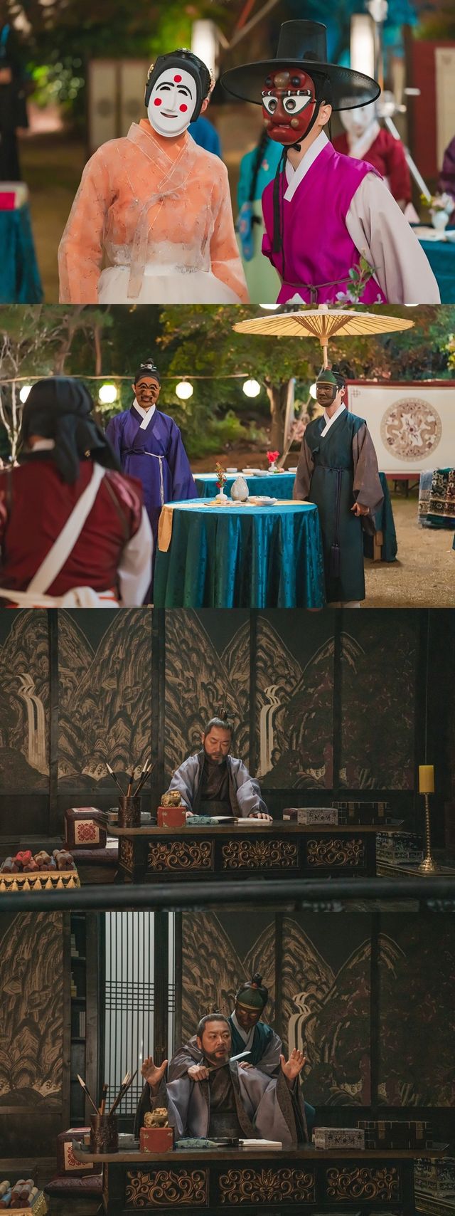 그런가 하면 용천루의 주인 천방주는 시끌벅적한 전야제를 뒤로하고 혼자 자신의 거처에서 일에 집중하고 있다. 그러나 평온함도 잠시, 탈을 쓴 괴한이 나타나 천방주의 목에 칼을 들이대며 그를 협박하는 모습이 포착됐다. 사진 속 천방주는 두 손을 들고 괴한의 협박에 굴복한 모습으로 극의 긴장감을 극대화한다.