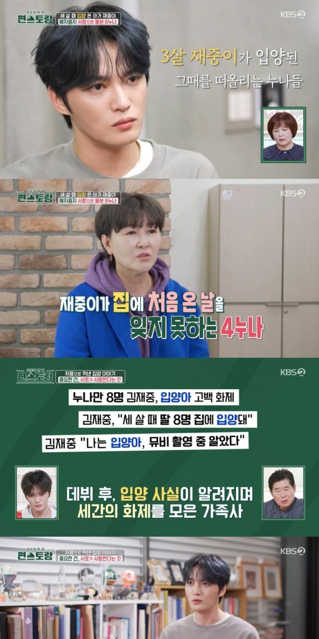 이어 남매들은 지금껏 조심스러워 차마 하지 못했던 김재중의 입양과 관련된 이야기를 꺼냈다. 누나들은 처음 동생 김재중과 마주한 날에 대한 기억을 회상했다. 특히 4누나는 “재중이가 처음 우리 집에 왔을 때…”라며 울먹이기도. 이날 누나들과 자신의 입양과 관련된 이야기를 처음 해봤다는 김재중은 “(입양됐다는 사실이) 중요하다고 생각하지 않는다. 현재가 더 중요하다. 지금 가족이 굉장히 소중하다”라고 말했다. 또 입양에 대한 자신의 소신도 밝혀 눈길을 끌었다.