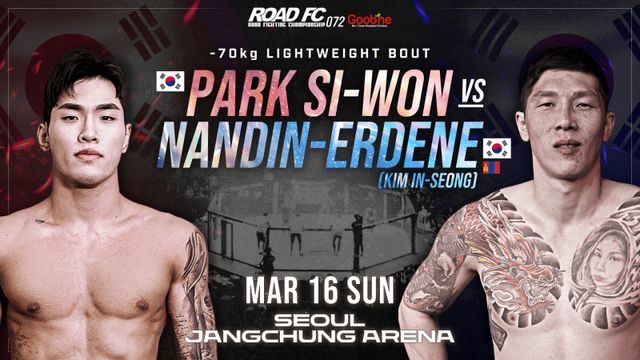 로드FC가 오는 3월 16일 서울 장충체육관에서 개최하는 굽네 ROAD FC 072에서 ‘로드FC 라이트급 최연소 챔피언’ 박시원(23·다이아MMA)과 몽골 복싱 국가대표 출신의 ‘귀화 파이터’ 난딘에르덴 (한국명: 김인성, 38·전욱진 멀티짐)이 대결한다.