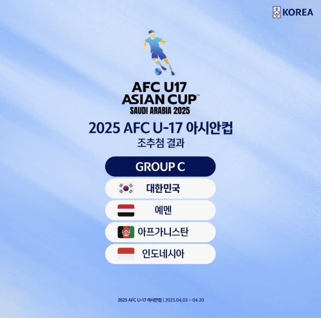 지난 23일 말레이시아 쿠알라룸푸르에서 열린 2025 AFC U-17 아시안컵 조 추첨 결과, 한국은 인도네시아, 예멘, 아프가니스탄과 C조에 묶였다.