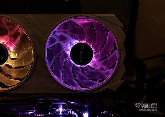 효율적인 쿨링 성능도 제공한다. 120mm 듀얼 팬은 GPU 온도가 일정 수준 이상일 때만 동작하도록 설계된 팬 스톱 기능을 지원한다. 저부하 상태에서는 팬이 멈춰 무소음 환경을 제공하며, 고부하 상태에서도 팬은 2000RPM으로 작동하며 최대 소음 30.5dBA로 억제된다. 또한, Hydraulic 베어링 기술을 적용해 마찰을 줄이고, 내구성과 정숙한 작동을 보장한다.