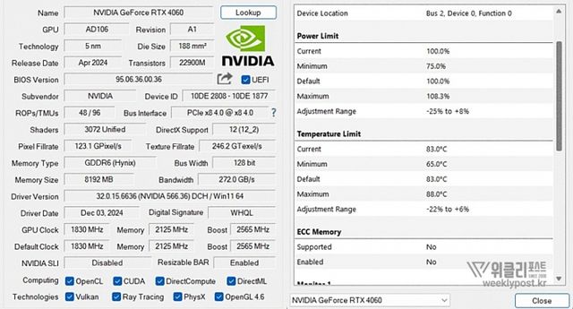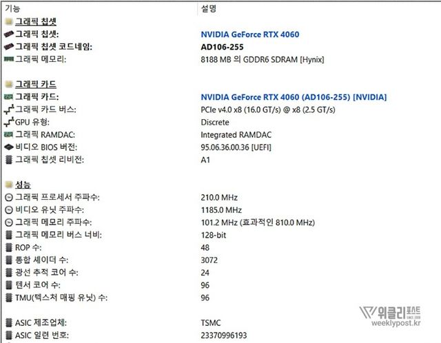 칩셋: NVIDIA GeForce RTX 4060 (4nm 공정, 쿠다 프로세서 3072개)