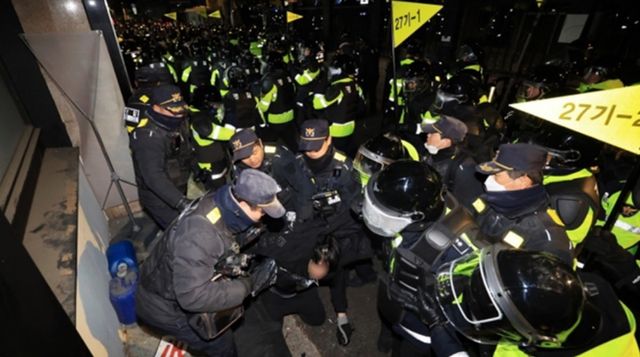 윤석열 대통령이 내란 우두머리 혐의로 구속되자 지지자들이 서울 마포구 서울서부지방법원에 난입한 19일 오전 서부지법 후문 인근에서 경찰이 시위 중인 윤 대통령 지지자를 끌어내고 있다. / 연합뉴스