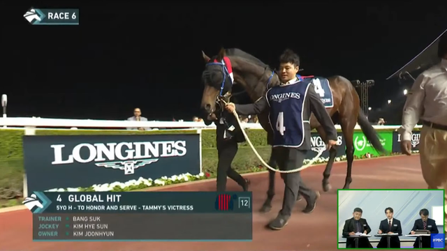 첫 해외원정인 데다 ‘카비르칸(KABIRKHAN)’, ‘팩터슈발(FACTEUR CHEVAL)’, ‘워크오브스타즈(WALKOFSTARS)’ 등 국제 레이팅 120에 달하는 세계 유수의 경주마가 라이벌로 등장했다. 게다가 가장 선호하지 않는 최외곽 게이트 배정까지. 운이 따라주지 않는 경기였지만 ‘글로벌히트’와 김혜선 기수는 중동의 낯선 모래주로 위에 모든 것을 쏟아부었다. 결과는 12두 중 8위.