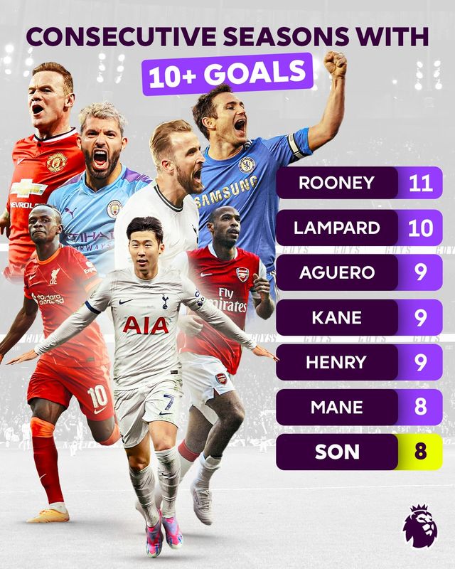 손흥민은 지난 시즌 프리미어리그 17골을 기록, 리그 기준 여덟 시즌 연속 두 자릿수 득점을 기록했다. 이는 티에리 앙리, 사디오 마네와 동률이다. 올 시즌 리그 6골을 기록 중인 그는 네 골만 더 넣으면 아홉 시즌 연속 리그 두 자릿수 득점으로 영혼의 단짝 해리 케인, 맨시티의 위대한 스트라이커 세르히오 아구에로와 동률을 이룬다. 손흥민 앞에는 두 선수 외에 프랭크 램파드(10시즌), 웨인 루니(11시즌)만 존재한다.