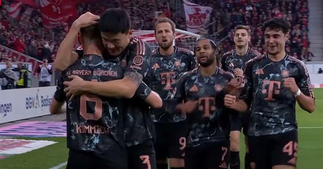 김민재가 골을 넣고 동료들과 함께 기뻐하고 있다. 김민재 뒤로 해리 케인이 보인다. / 분데스리가 유튜브 영상 캡처