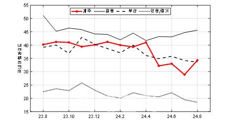 원화 가치가 떨어지면 해외보다 국내 여행에 대한 수요가 늘겠지만 이를 제주도가 아닌 강원도와 부산 등 다른 국내 여행지가 흡수했을 가능성이 크다는 것이다. 보고서에서는 컨슈머인사이트가 집계한 국내 주요 여행지에 대한 관심도 설문결과를 인용해 강원도여행에 대한 관심도는 상승세를 보이고 있는 반면, 제주 여행에 대한 관심도는 최근 많이 하락하고 있다고 전했다.