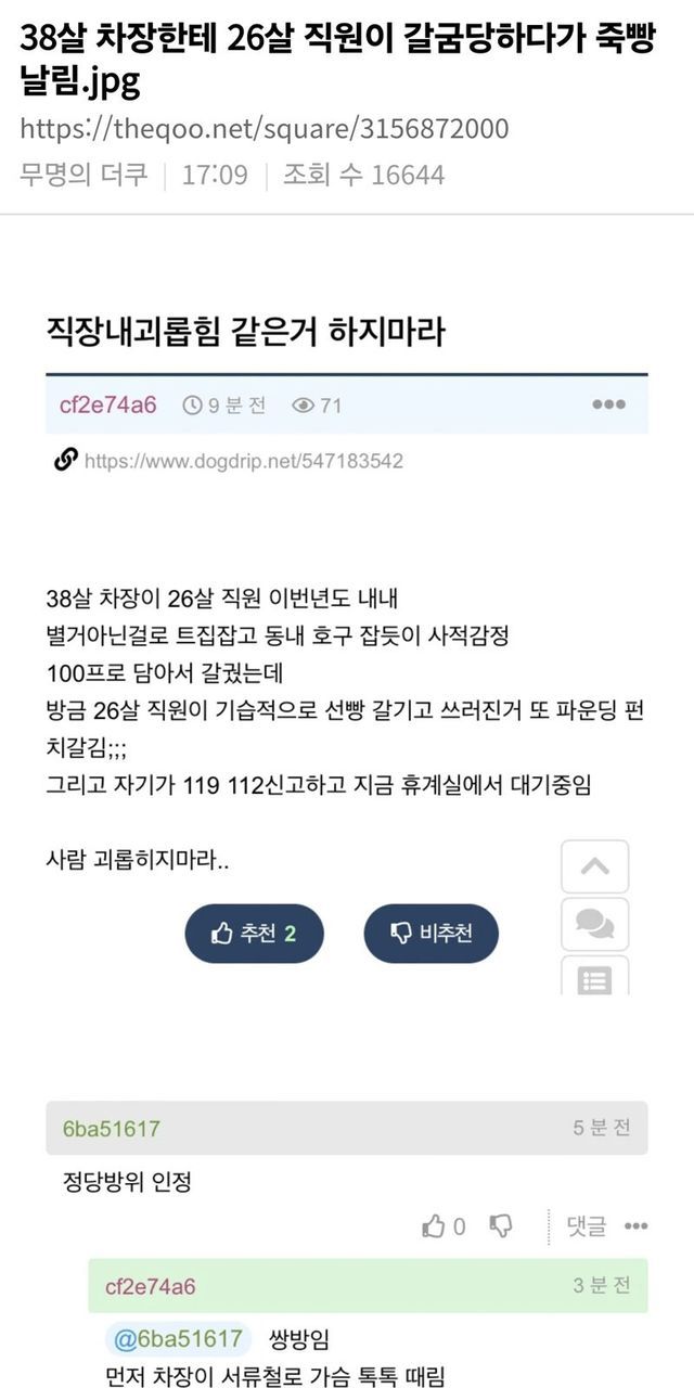 38살 차장한테 26살 직원이 갈굼당하다가 죽빵날림+후속