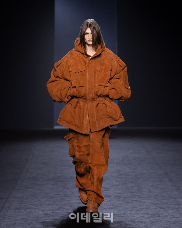 준지는 2025년 FW 시즌 테마를 ‘커버언커버(COVERUNCOVER)’로 잡고 런웨이 공간과 컬렉션 의상 디자인을 통해 극적인 대비를 강조했다. 준지는 소재와 디자인 측면에서 대조적인 형태가 돋보이는 남녀 의상 38개 착장을 선보였다. 특히 데님과 스웨이드 등 소재를 사용해 밀리터리룩을 표현하는데 공을 들였다.