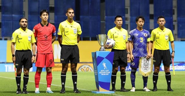 2023년 7월 2일(현지시간) 태국 빠툼타니 스타디움에서 열린 아시아축구연맹(AFC) U-17 아시안컵 결승전 대한민국과 일본의 경기를 앞두고 대한민국 대표팀 주장 김명준과 일본 대표팀 주장 코스기가 심판들과 기념촬영을 하고 있다 / 뉴스1(대한축구협회 제공)