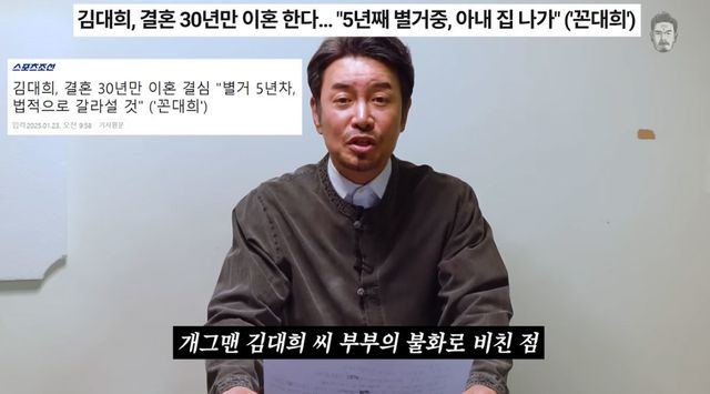 지난 24일 유튜브 채널 ‘꼰대희’에는 ‘꼰대희입니다 드릴 말씀이 있습니다’라는 제목의 영상이 게재됐다.해당 영상에서 김대희는 부캐 꼰대희로 변신해 “죄송합니다, 먼저 사죄의 말씀을 드린다. 금번 저희 꼰대희 채널에 업로드된 ‘이혼할 결심’이라는 콘텐츠로 인해 많은 분들에게 오해의 소지를 남긴 것 같아서 이 영상을 찍게 됐다”고 말문을 열었다.