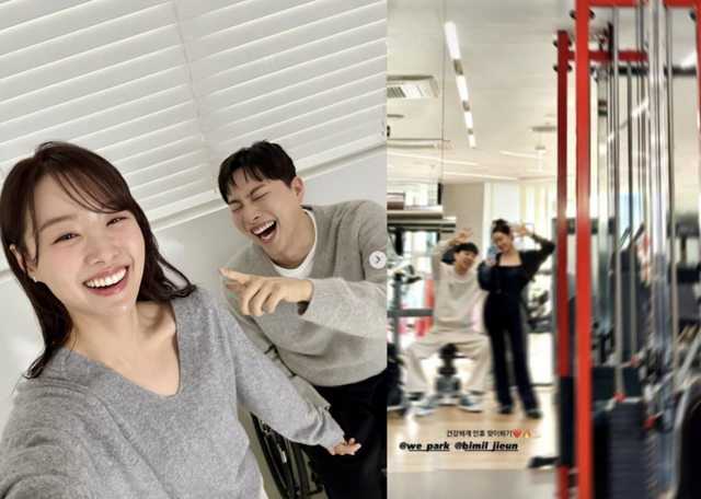 또 다른 사진에서는 송지은은 박위와 함께 짐을 찾아 운동을 하고 있는 모습이다. 송지은은 사진에 “건강하게 연휴 맞이하기”라고 적었다.