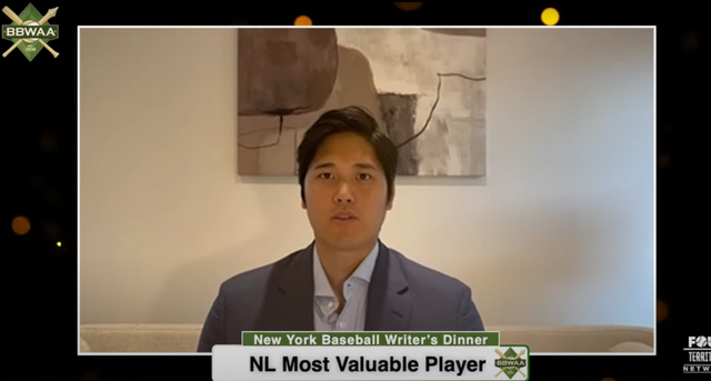 한편 AL MVP 저지 역시 영상 메시지를 통해 “MVP를 수상하게 돼 영광”이라며 “아내와 나는 첫 아이를 맞이할지도 모르는 상황이라 부득이하게 참석하지 못했다”라고 사과 메세지를 전하기도 했다.