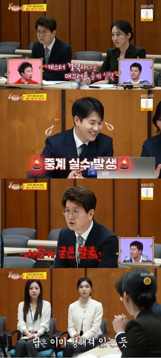 이날 엄지인은 선배 이재후와 함께 배구 캐스터 오디션 심사에 나섰다.