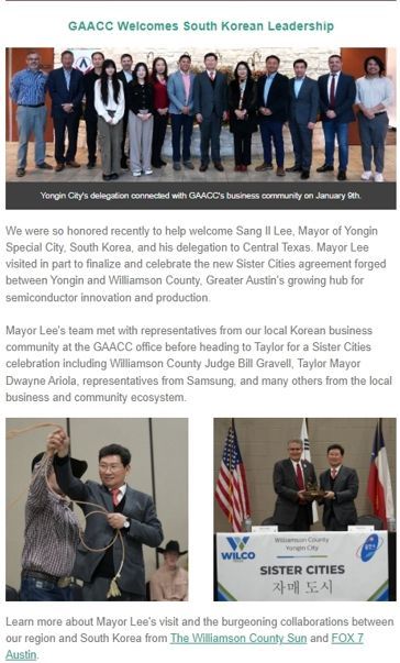 ‘광역오스틴 아시안상공회의소’는 이상일 시장의 미국방문 소식, 용인과 윌리엄슨 카운티의 자매결연 체결과 이를 보도한 기사 내용을 담은 주간 뉴스레터를 각 회원사와 구독자에게 발송했다.