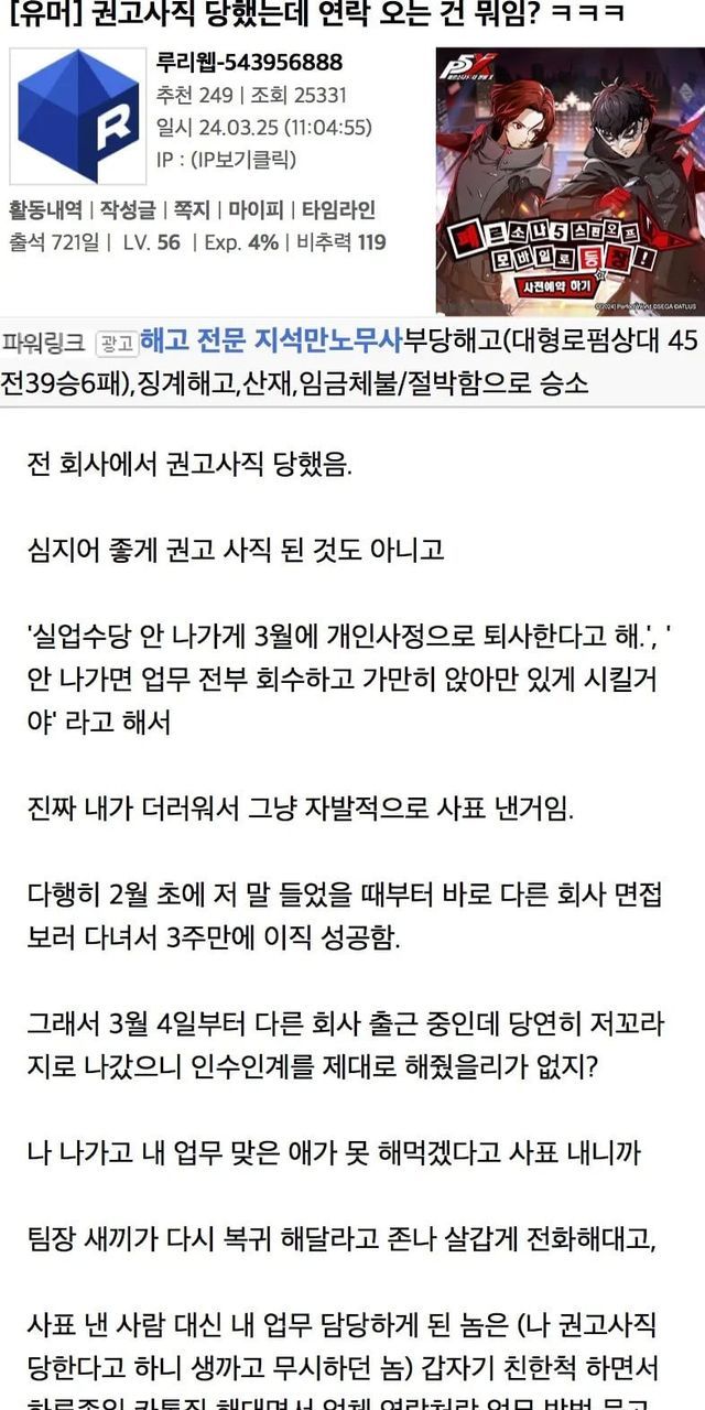 권고사직 당했는데 전 직장에서 연락온 루리인