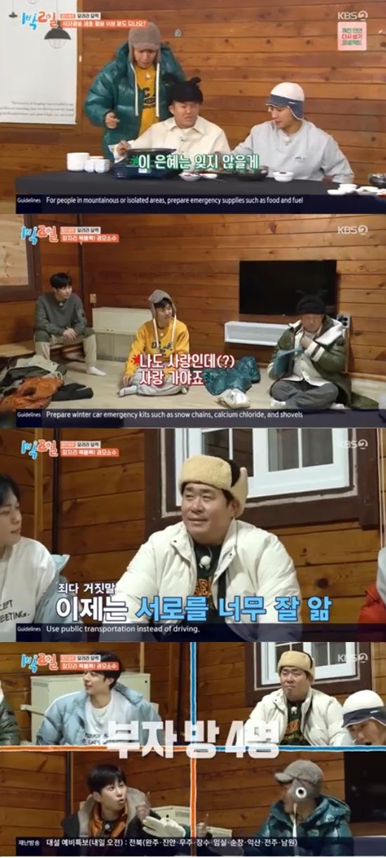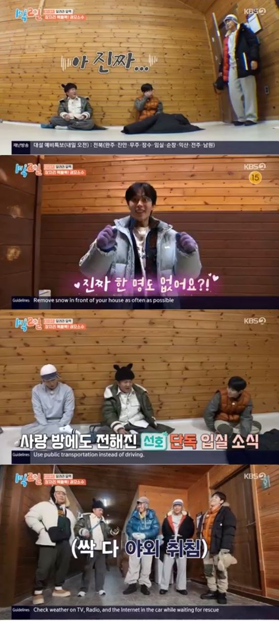 방 선택 결과 사랑 방에는 딘딘, 조세호, 이준, 건강 방에는 김종민과 문세윤이 들어갔다. 막내 유선호 혼자 부자 방으로 입실하면서 실내취침을 확정지었다.