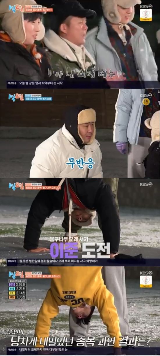멤버들은 김종민이 자신 있다고 낸 물구나무 오래 서기에 도전했다. 이준이 3.95초를 기록한 가운데 문세윤은 1.05초를 기록한 뒤 "너무 수치스럽다"고 했다.