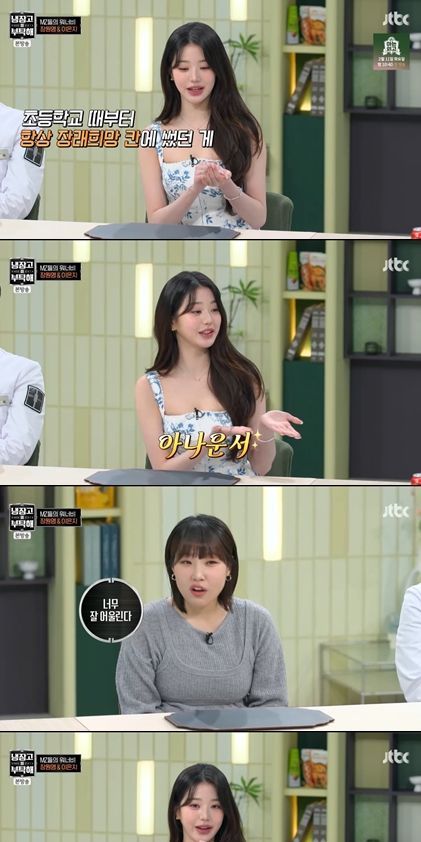 한편, 장원영은 "저는 초등학교 때부터 항상 장래희망 칸에 썼던 게 아나운서였다"라고 밝혔다. 이에 이은지는 "너무 잘 어울린다"라며 호응했다.
