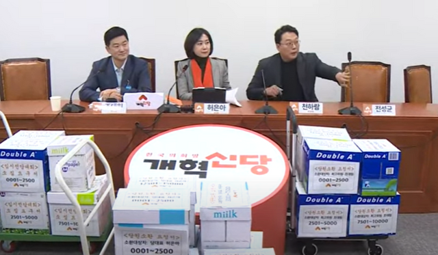 이준석파는 허은아파를 당원소환제로 축출하려고 하고 있다. 당원소환제 서류 뭉치가 회의실에 있는 모습. <사진=jtbc 캡처>