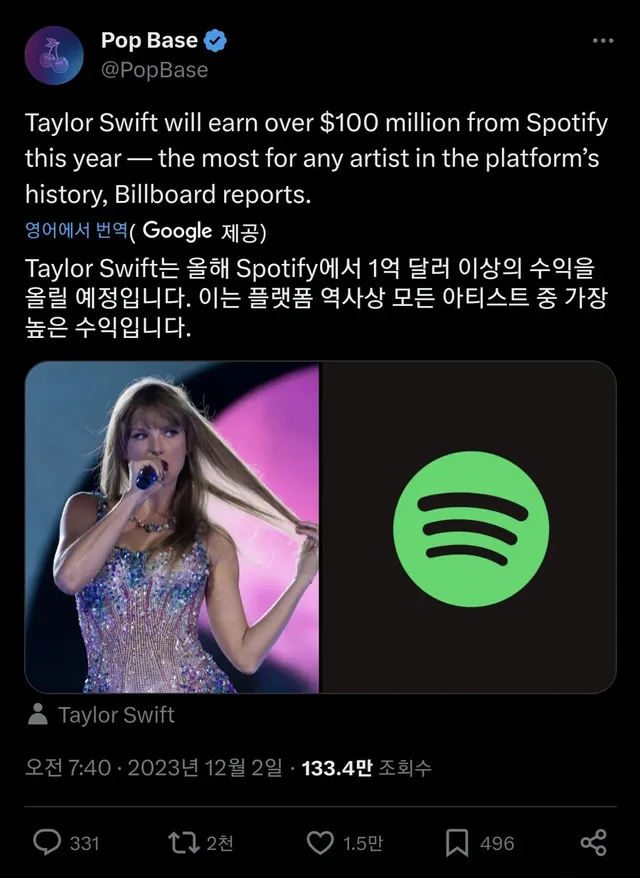 음원 수익만 1억 달러 이상