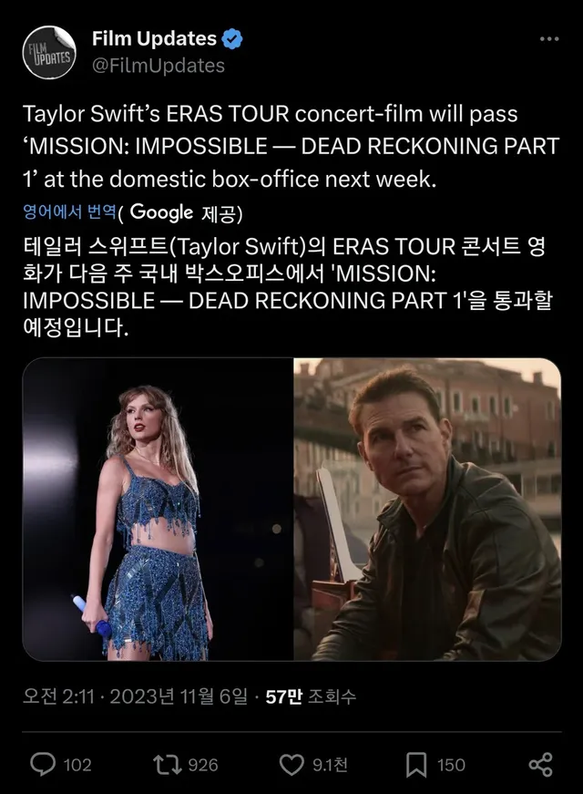 콘서트 실황 영화가 미션 임파서블마저 이기고 박스오피스 1위함