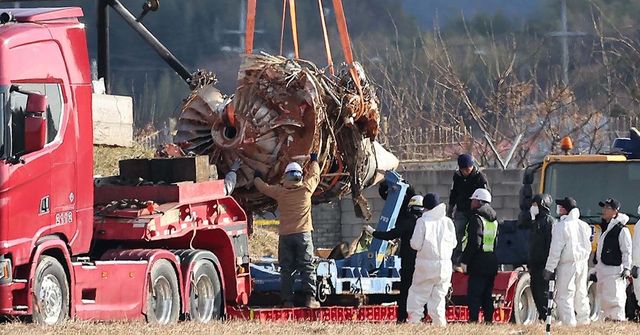 전남 무안국제공항 참사 현장에서 로컬라이저(방위각시설) 둔덕에 파묻힌 제주항공 7C2216편의 엔진이 트럭으로 옮겨지고 있다. 2025년 1월 4일 사진이다. / 뉴스1