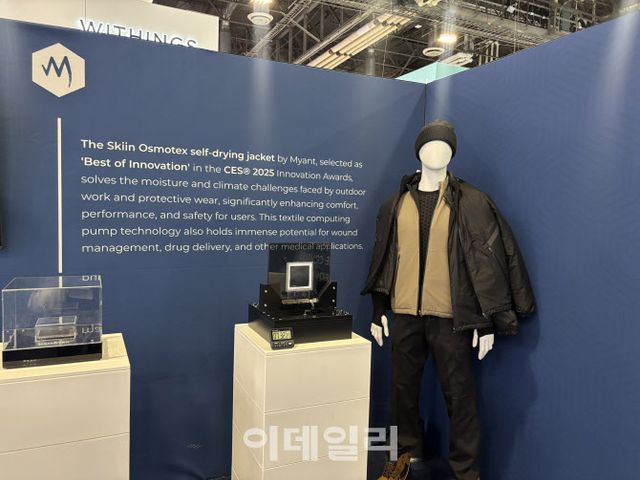 아울러 마이앤트는 땀이 많은 사람을 위해 자동으로 수분이 배출되는 자동수분관리 의류 ‘오스모텍스’도 개발했다. 지난 7일(현지시간) 열린 미국 라스베이거스에서 열린 세계 최대 가전·IT 전시회 ‘CES 2025’를 앞두고 혁신상을 수상한 제품이기도 하다. 운동 중에도 사용할 수 있는 기술로 마이앤트는 전기삼투 현상을 의류에 적용했다. 땀은 물론 수분 제어까지 가능한 점퍼다.