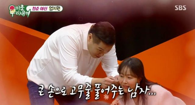 최강 동안의 비결을 묻는 서장훈에게 엄지원은 “붓기 관리에 신경을 쓴다. 귀에 고무줄을 걸면 메이크업하는 동안 붓기가 쭉쭉 빠진다”라며 직접 시범을 보이다 고무줄이 귀에 걸리는 해프닝이 벌어졌다. 엄지원이 서장훈의 도움을 받아 고무줄을 빼자 신동엽은 “고무줄 플러팅이다”라며 흐뭇한 미소를 지었다.