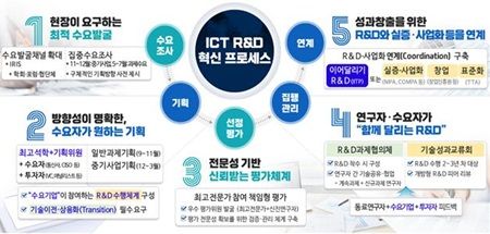 정보통신기술 분야는 현장이 요구하는 최적 수요를 발굴하여, 방향성이 명확한 수요자가 원하는 연구개발 기획을 추진하고, 전문성 기반의 신뢰받는 평가체계와 기술 공유·축적 및 연구자 간 시너지 강화를 위한 과제협의체, 기술·성과교류회의 운영 등 기술수요조사부터 기획·평가·관리와 성과환류에 이르는 정보통신기술 연구개발 과정 전주기를 개선한다는 계획이다.