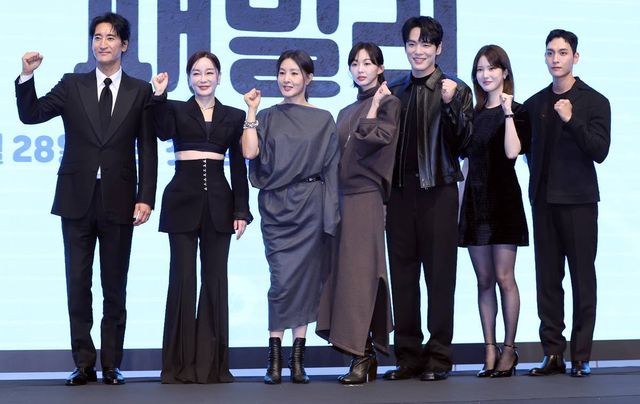 2024년 9월 25일 오후 서울 구로구 더세인트웨딩에서 열린 KBS2 특별기획 주말드라마 다리미 패밀리 제작발표회에서 출연 배우들이 포즈를 취하고 있다. 왼쪽부터 신현준, 김혜은, 박지영, 금새록, 김정현, 양혜지, 최태준 / 뉴스1